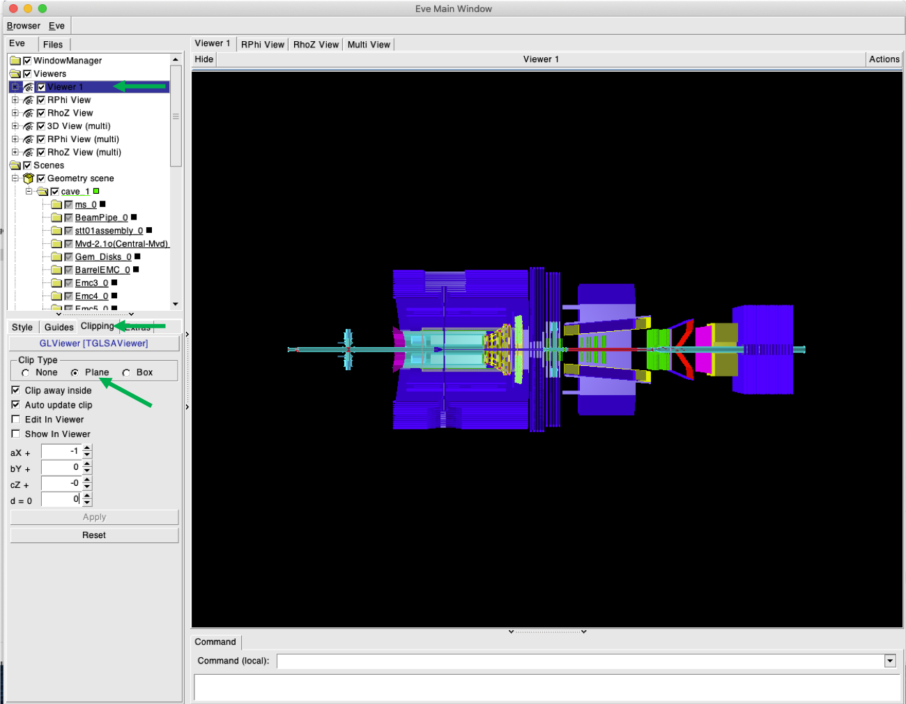To get a better view of the various detector components it is possible to clip the view by using the Clipping tool of the viewer. This tool can be reached via Viewers, Viewer 1 and the tab Clipping.