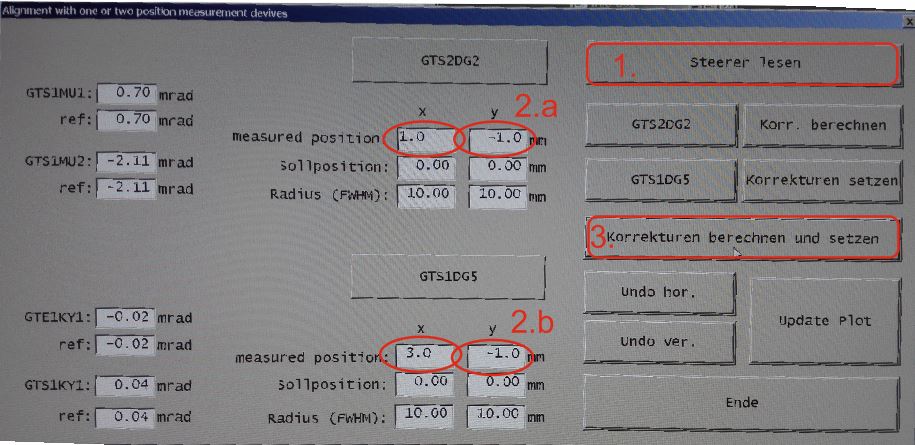 wanted position (Sollposition) is 0 in x and y on both detectors.