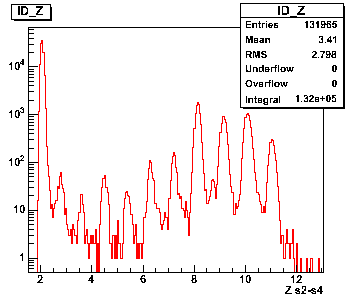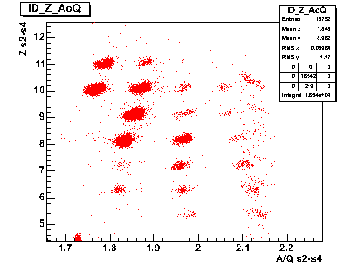 The best separation you get in a two-dimensional plot of TOF vs. energy deposition in the MUSIC. Calibrated it becomes A/Q vs. Z. Here different fragments show up as separated blobs like in the examples below.