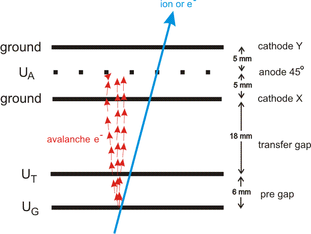 The MWPC has three grids. Anode (A), (G) and (T). Electrons are emitted from the gap around or the cathode material. Towards the thin anode wires the electron current is amplified by secondary electrons in an avalanche process. The gap is filled with a CO2 / Argon mixture.