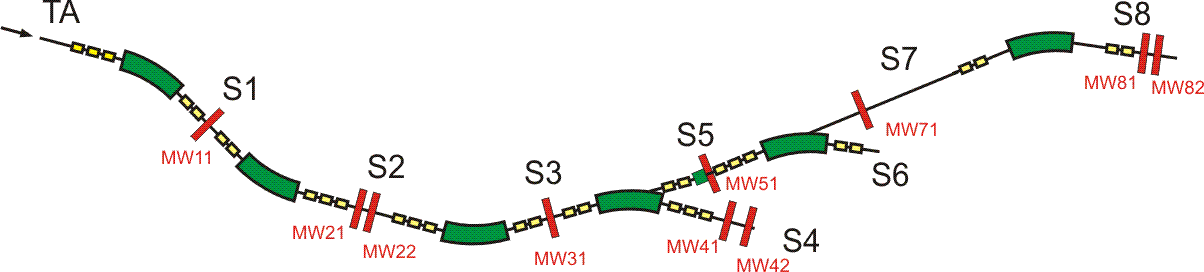 The detectors operate with a mixture of argon, CO2 and a little alcohol at atmospheric pressure. The gas flow can be controlled independently for the four focal planes S1 through S4 and is set to roughly 5 l/hour. Before the detectors can be used, gas flow has to be provided for at least 12 hours. The GSI detector laboratory (Dr. C.J. Schmidt, Mr. Michael Träger (Tel. 2639)) takes care of the gas supply unit and has to be informed in advance. The gas flow is controlled, mixed and monitored from the cupboard in front of the cave entrance, see picture.