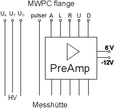 The Preamplifiers are located directly at the flange with connectors to the MWPCs. the pulser entrance goes directly to the center of the delay lines.