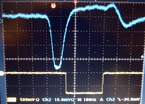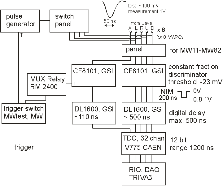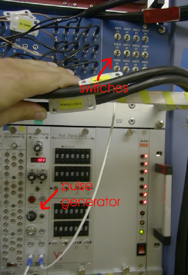 A pulser signal can be fed to the middle of the delay line. From the pulse generator (see picture) the pulse can be distributed to all MWPCs with the many switches. Only cathodes can be tested. To get a trigger signal use the switch "MW pulser" from trigger box 2 and select TB2 in trigger box 1.